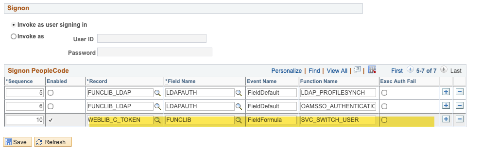 The iScript lives in a custom WebLib (for example WEBLIB_C_TOKEN.ISCRIPT1.FieldFormula.IScript_Switch). Target users must have permission to that WebLib — typically via a permission list granted to every user who might be on the allow-list. Without that grant, the signon pipeline will switch to the target user but the iScript itself will refuse to execute.